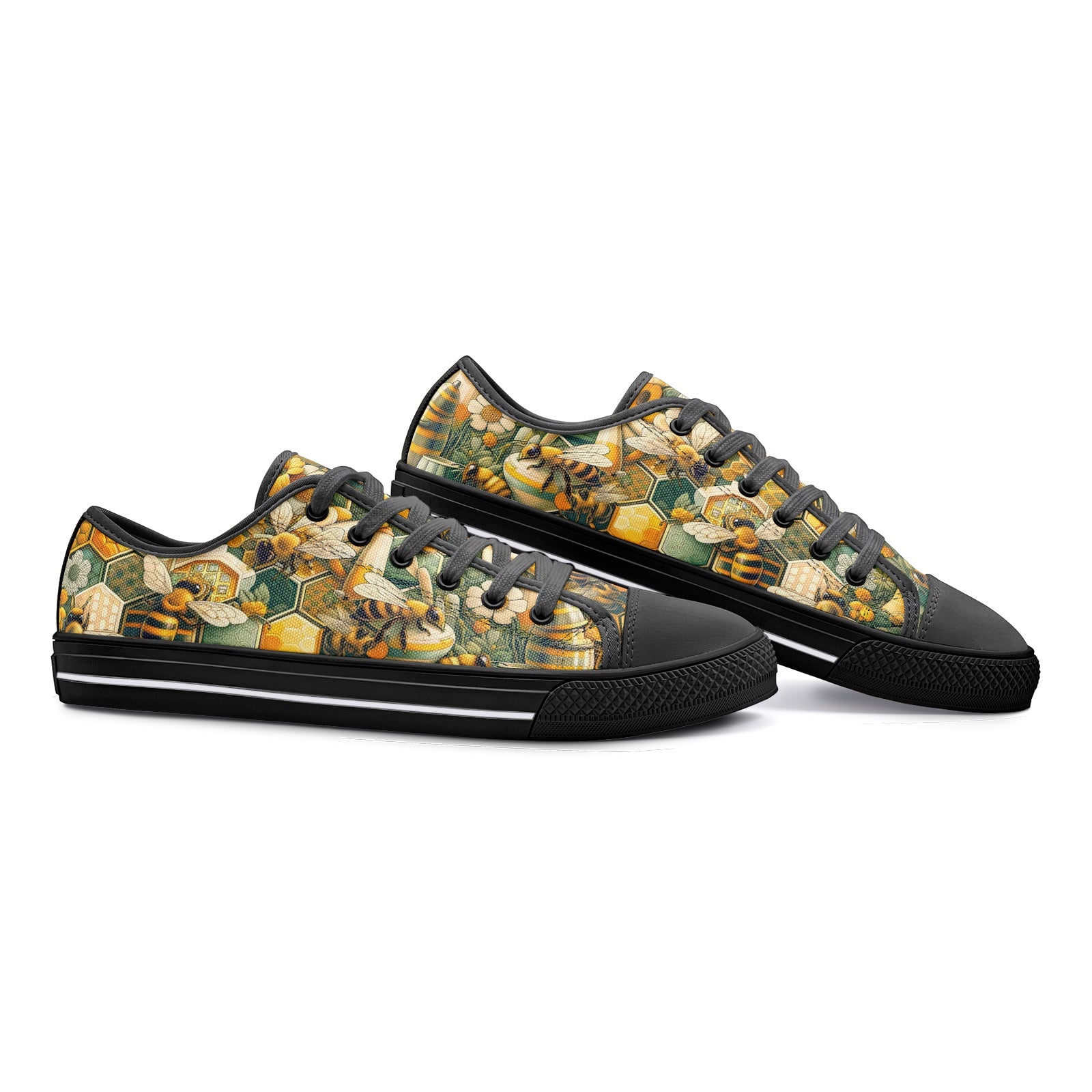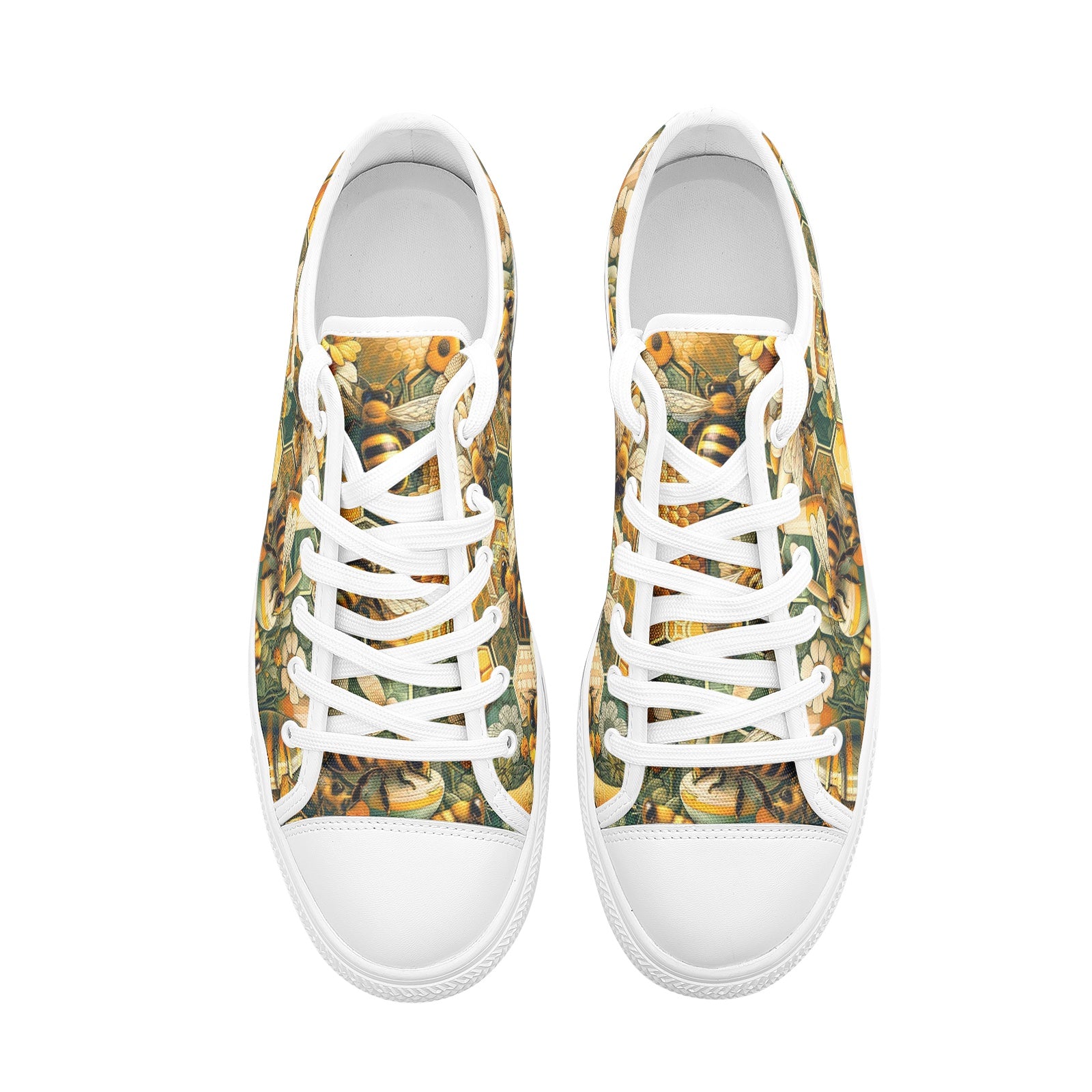 Step into the vibrant world of nature with our "Beekeeper's Bloom White Toe Canvas Low Tops", a stunning footwear choice for those who appreciate the delicate balance of our ecosystem. Inspired by the bustling life of a honey bee farm, these shoes feature an exclusive fabric pattern, adorned with intricate details of honeycombs, busy bees, blossoming flowers, and traditional beekeeping tools.