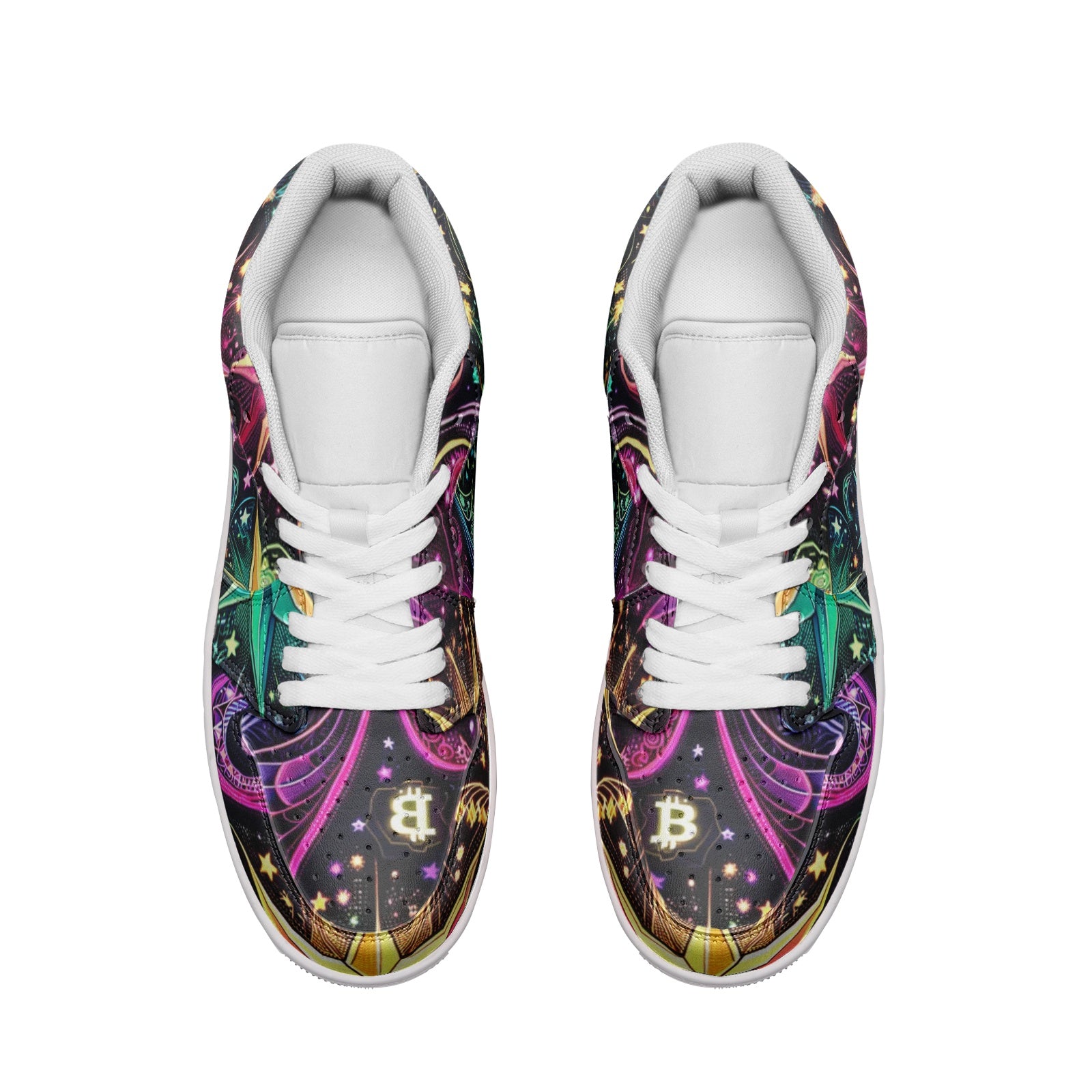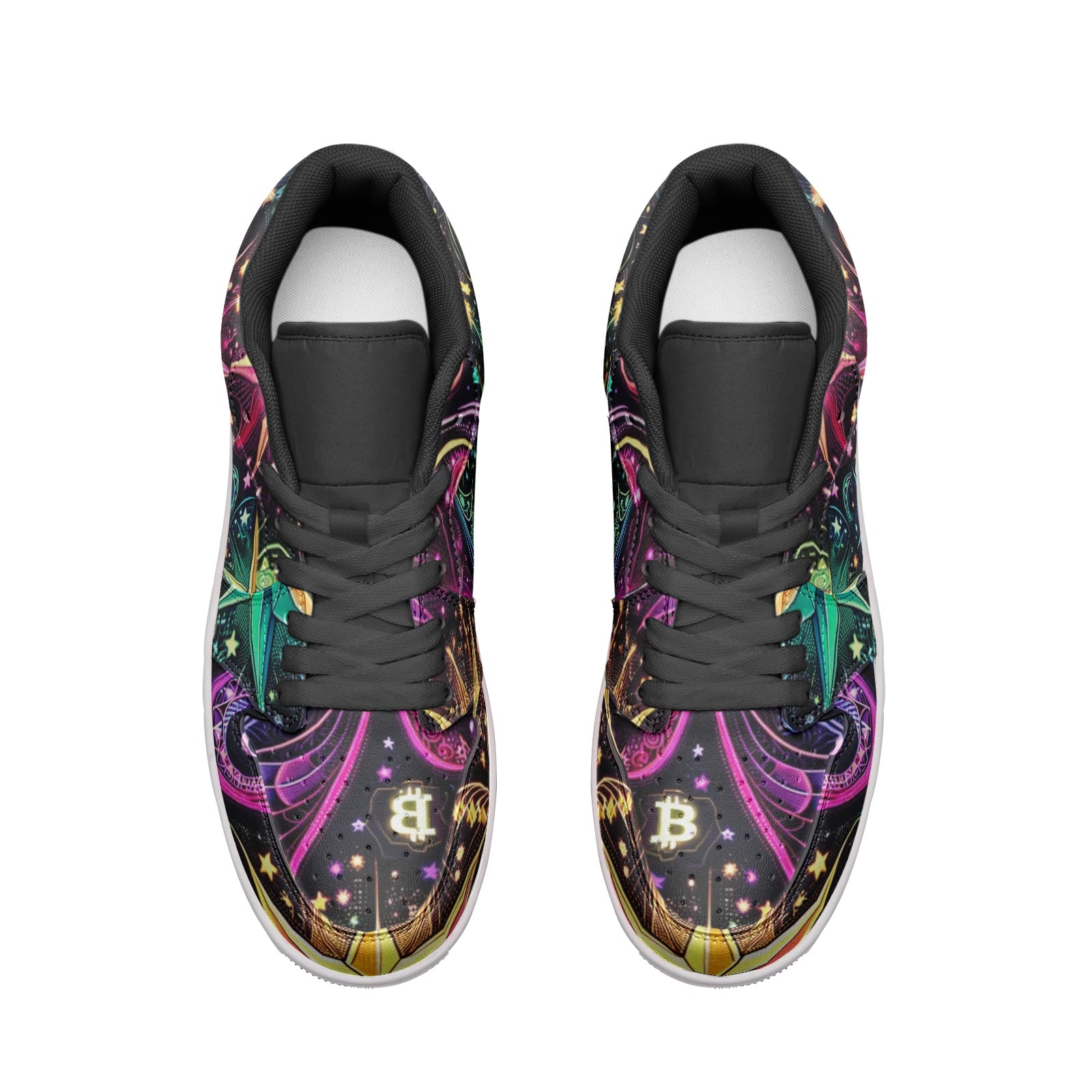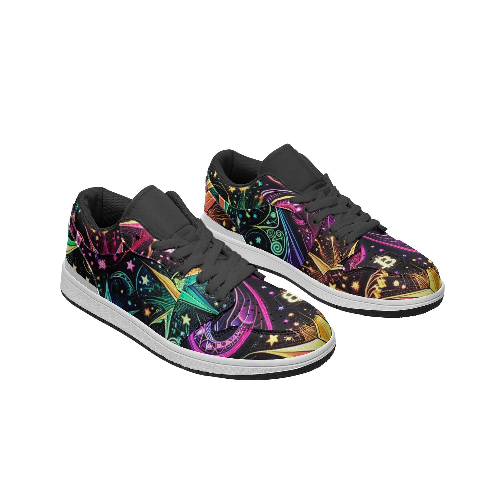 Introducing the "Crypto Cosmos Low Tops," a revolutionary fusion of art, mathematics, and digital culture. These sneakers are an ode to the wonders of the universe and the modern digital era. The design features an exclusive 'Crypto Cosmos' pattern with a rich, dark background, illuminated by stars in neon hues that weave through Fibonacci spirals and discreet Bitcoin symbols.